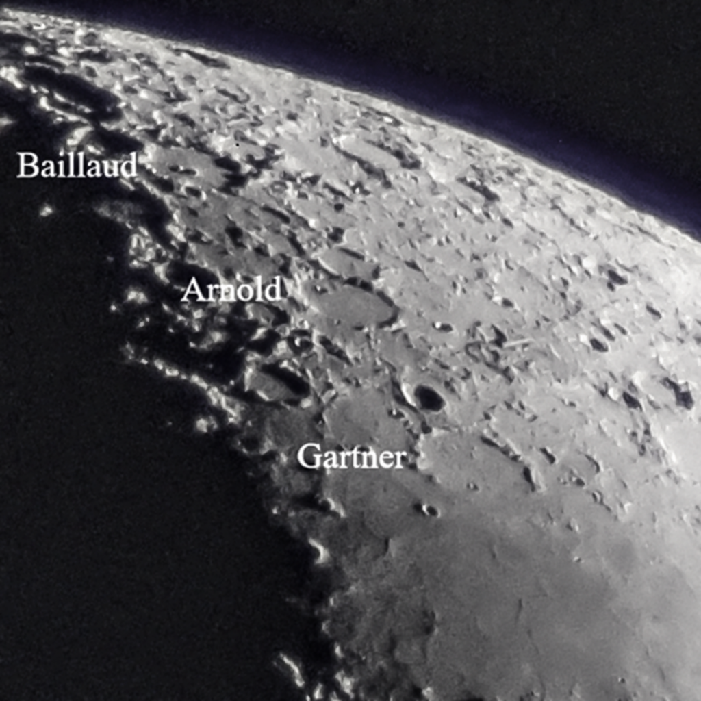 Arnold es un viejo cráter de 95 km de paredes muy desgastadas. Su interior es liso y sin pico central. La lava que salió de su interior destruyo, prácticamente, por completo parte de su muro suroccidental. En su lugar hay un pequeño cráter de solo 6 km que constituye todo un reto para pequeños telescopios. Dentro del cráter, en la parte norte, hay otro pequeño cráter de 10 km. El nombre se lo puso Schröter en su mapa de 1802.