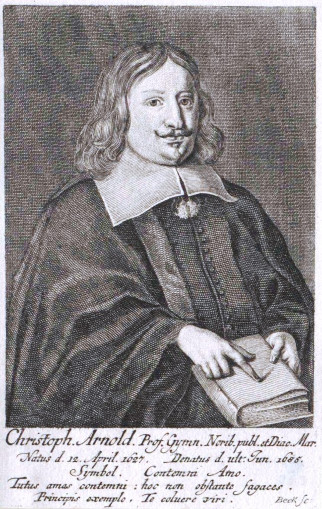 Cristoph Arnold (1650 – 1695) nació en la ciudad alemana de Sommerfeld, al norte de Berlín. Era granjero de profesión, pero astrónomo de afición. Consiguió fama como astrónomo en su localidad al descubrir en 1683 un cometa 8 días antes que Hevelius. Daba clases de astronomía a jóvenes entre los que se encontraba María Winckelmann. En 1686 lo visitó Kirch, que era uno de los astrónomos más famosos de Alemania y conoció a María, con la que se casó en 1692 a pesar de ser 30 años mayor. Ese mismo año Arnold escribió un tratado que describía el tránsito de Mercurio por el Sol ocurrido dos años antes. Murió a los 45 años.