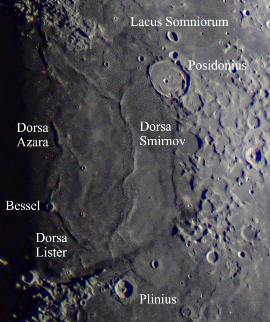 La Luna de 6 días es perfecta para observar las olas (pliegues de lava llamados dorsales) del mar de la Serenidad. La dorsa Smirnov tiene una longitud aproximada de unos 220 km. Es una de las dorsales más espectaculares de la Luna. La UAI le puso ese nombre en 1976 en honor al geólogo soviético Sergei Sergeevich (1895 – 1947) Smirnov. La dorsa Lister parte del este, prácticamente una continuación de la dorsa Smirnov, avanza hacia el suroeste y luego sube hasta el cráter Bessel. Tiene una longitud aproximada de unos 180 km y en 1976 la UAI le puso el nombre en honor al médico inglés Marin Lister (1639 – 1712). Y más al norte tenemos la dorsa Azara de unos 100 km de longitud. En 1976 la UAI le puso ese nombre en honor al naturalista español Félix de Azara