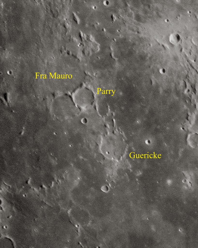 Guericke es un viejo cráter de 60 km muy desgastado. Sus paredes están rotas por muchos sitios y la altura máxima no supera los 700 metros. Aunque seguramente fue invadido por la lava basáltica, su fondo es más claro que la lava de los mares debido, probablemente a estar lleno de cascotes de eyecta de la formacón de otros cráteres más jóvenes como Parry. En su interior hay dos pequeños cráteres de 7 y 6 km. El nombre se lo puso Madler en su mapa de 1837.