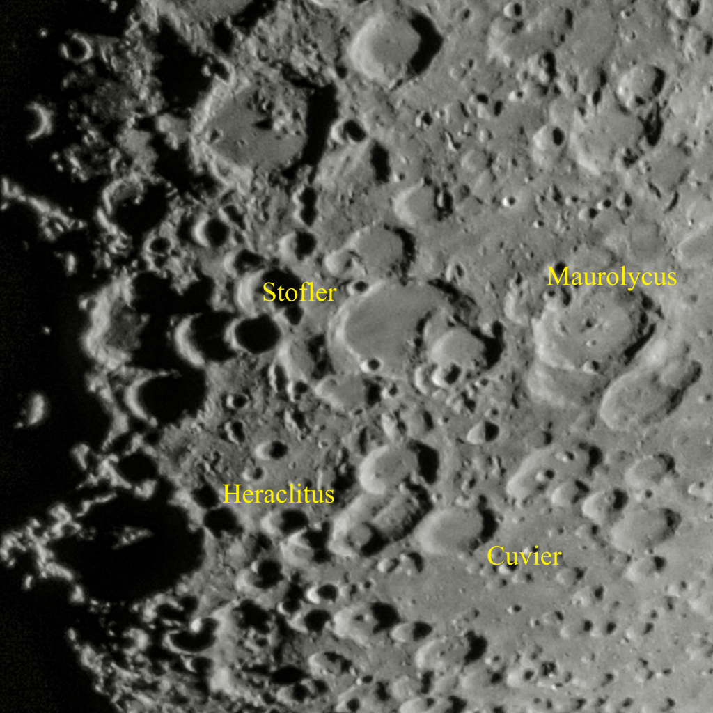 Stöfler es un antiguo cráter de 126 km cuya pared oriental ha sido completamente destruida por varios cráteres yuxtapuestos, siendo el mayor de ellos el cráter Faraday de 70 km. El suelo de Stöfler es liso y oscuro, rellenado de lava basáltica. Su pico central ha sido completamente destruido y no queda de él ningún rastro. Un pequeño cráter de 18 km está sobre la pared sur y otro similar se encuentra en la pared occidental. El nombre se lo puso Riccioli.